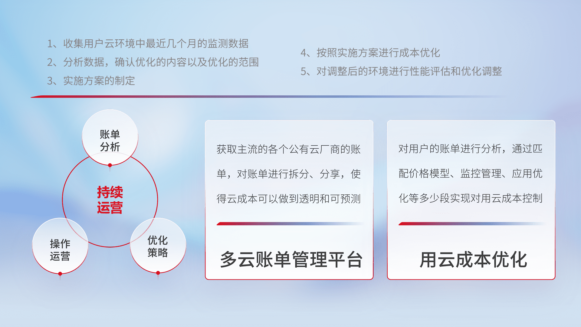 通过多云纳管,,,,以统一的资源数据模型把客户的云资源进行抽象和封装,,,进而实现对多云资源的统一操作,,保障云资源管理的可靠性、、稳定性与可用性。。。量身定制化运维内容,,配置、、、、开发运维、、补丁管理、、、、备份、、、监控、、、认证和访问管理、、、、审计和日常巡检等,,,保障在用云过程中的可靠度,,,稳定度以及高可用率。。